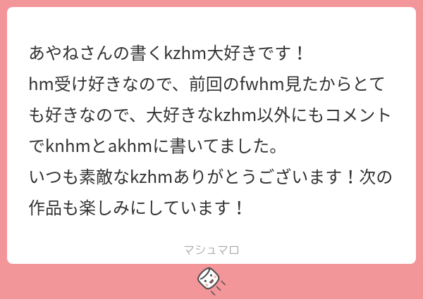 マシュマロありがとうございます!! 拙作を好きとおっしゃっていただけてすっごく嬉しいです! 最近とてもhm受けにはまっているので、そういう組み合わせの可能性もあるのか!? と驚きつつありだなと思う自分がいました……w 投票でコメントも送っていただきありがとうございました! 無事に形になるかは分からないのですが、もしアップしていたら見守っていただけると嬉しいです。
