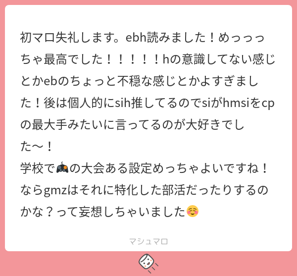 ebhm初書きだったのでドキドキしていたのですが、マロ&読んでいただきありがとうございました!