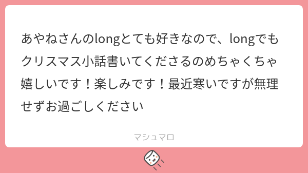 わ~~~~!!! ありがとうございます!!! そのお言葉がとても私のやる気に繋がっています!!! しかし、ちょっと思ってたより今回書いたlong⑦のCP色が薄めだったので、 また別の話でリベンジしたくなっています……(どうしてこうなった) 本当に最近寒いので、マロ主さまもお身体ご自愛くださいね。