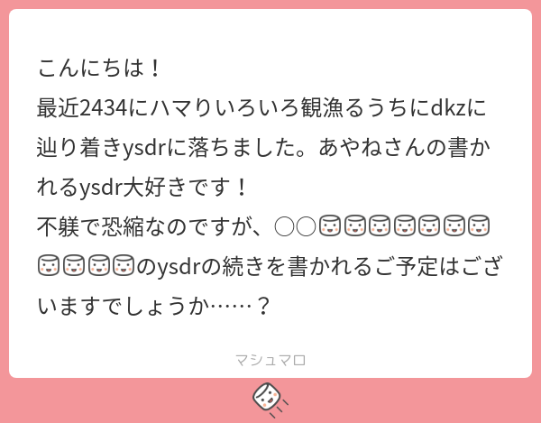 マシュマロありがとうございます! 私も同じ流れでysdrにはまったので親近感が湧いてしまいます! そして、作品を読んでいただきありがとうございました。 画像の通り、タイトルが伏せ字になってしまって分からないのですが、 もし修行部屋の作品の件でしたら、すっかり放置になってしまって申し訳ないです。。。 結構勢いで書いているところがありますので、タイミングが来たら続きに挑戦したいと思っております!! 気長にお待ちいただけると嬉しいです~。もし違う作品の話であれば、またご連絡ください!